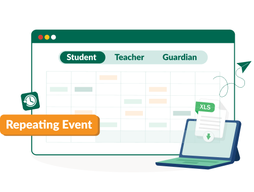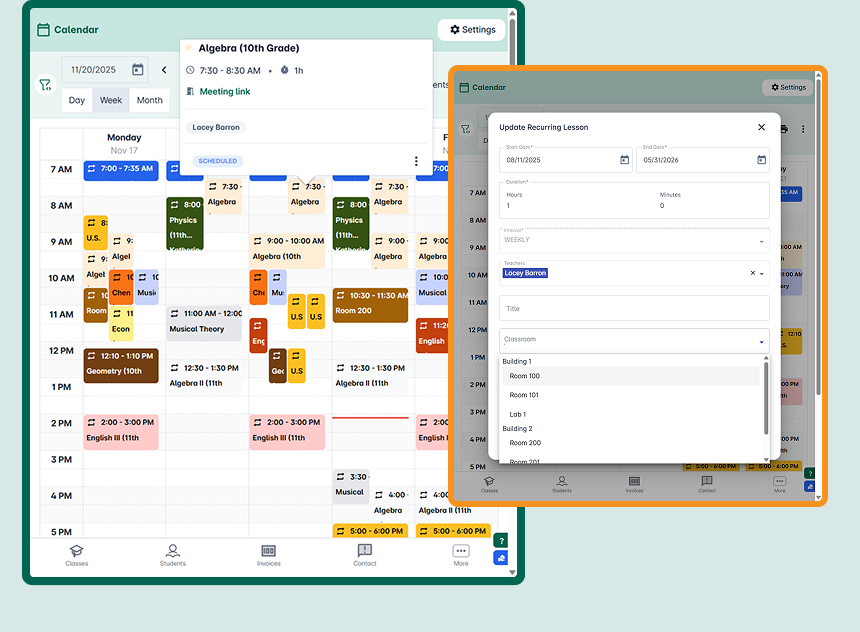 Design and manage recurring lessons, one-off events, and classroom bookings, all in one centralized calendar that teachers, students and guardians can rely on.