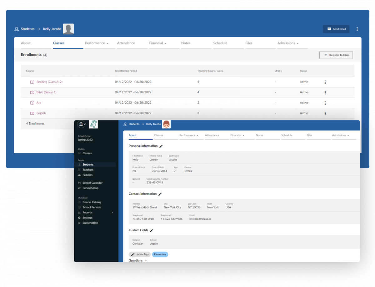 DreamClass offers the utilities you need to manage all student-related data, in the best possible way. It’s more than student information management software. And it helps school administrators and teachers perform fundamental administrative tasks: