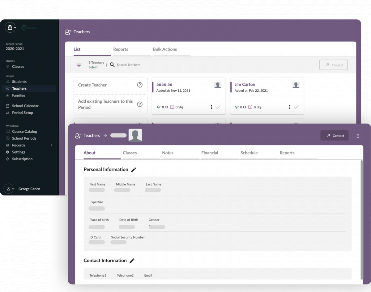 Give your teachers access to their profile; help them efficiently manage their classes, their students, school-related tasks and processes such as keeping gradebooks, create assessments, track attendance and more.